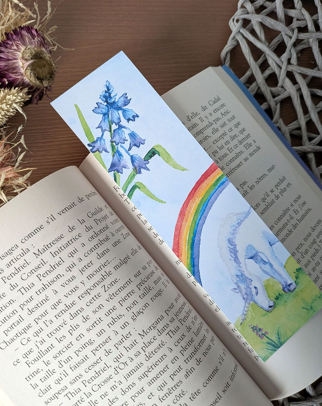 Invitez la magie du printemps et le merveilleux dans vos lectures avec ce marque-page artisanal au design peint à la main. Une licorne 🦄 entourée de clochettes bleues et d'un majestueux arc-en-ciel se délecte d'une herbe fraîche.