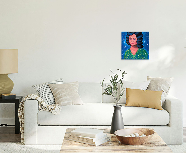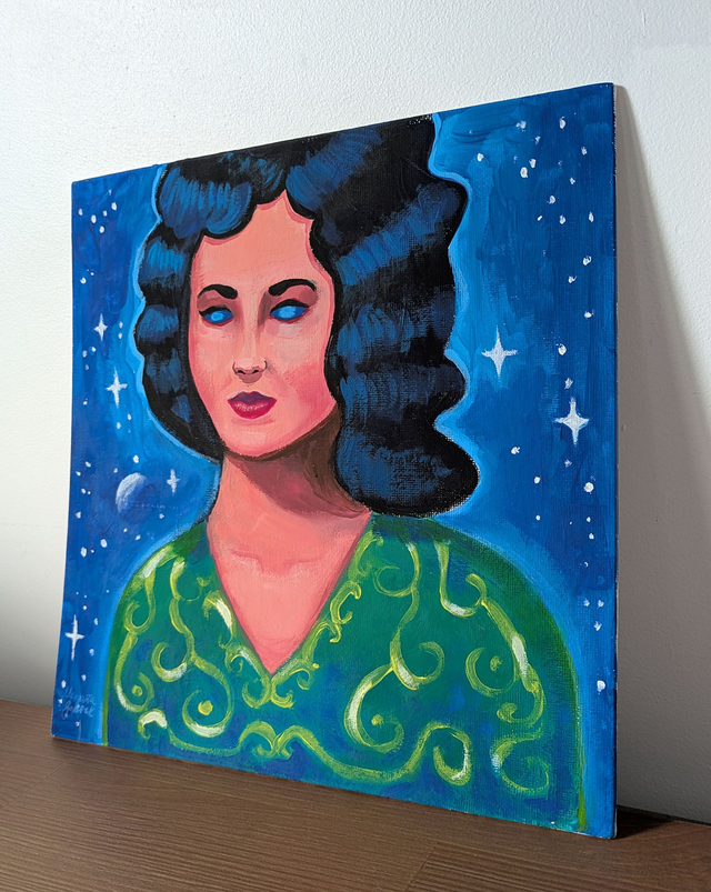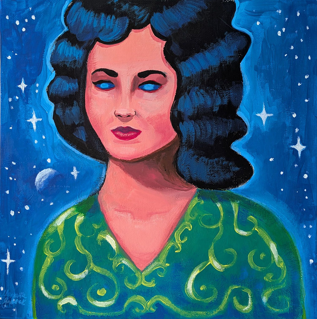 Une femme aux cheveux noirs corbeau ondulés, en robe vert clair vif et ornements dorés contemple l'espace en silence de ses yeux bleus laiteux. Une aura l'entoure. Avec assurance, elle attend le parfait alignement des étoiles.