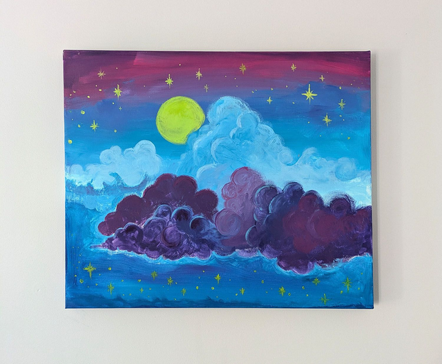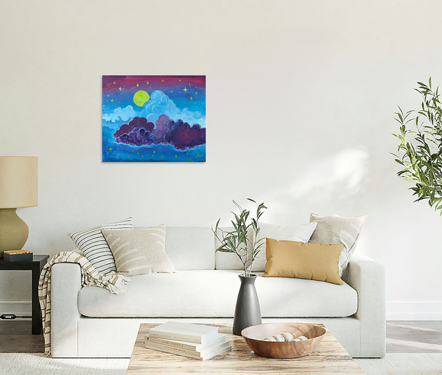 La lune aux teintes jaune clair, presque vertes, règne en maîtresse parmi les moutons de nuages. Le ciel bleu nocturne est parsemé d'étoiles, tels que de joyaux. J'ai envisagé cette œuvre comme une douce et apaisante couverture pour le sommeil de la nuit.